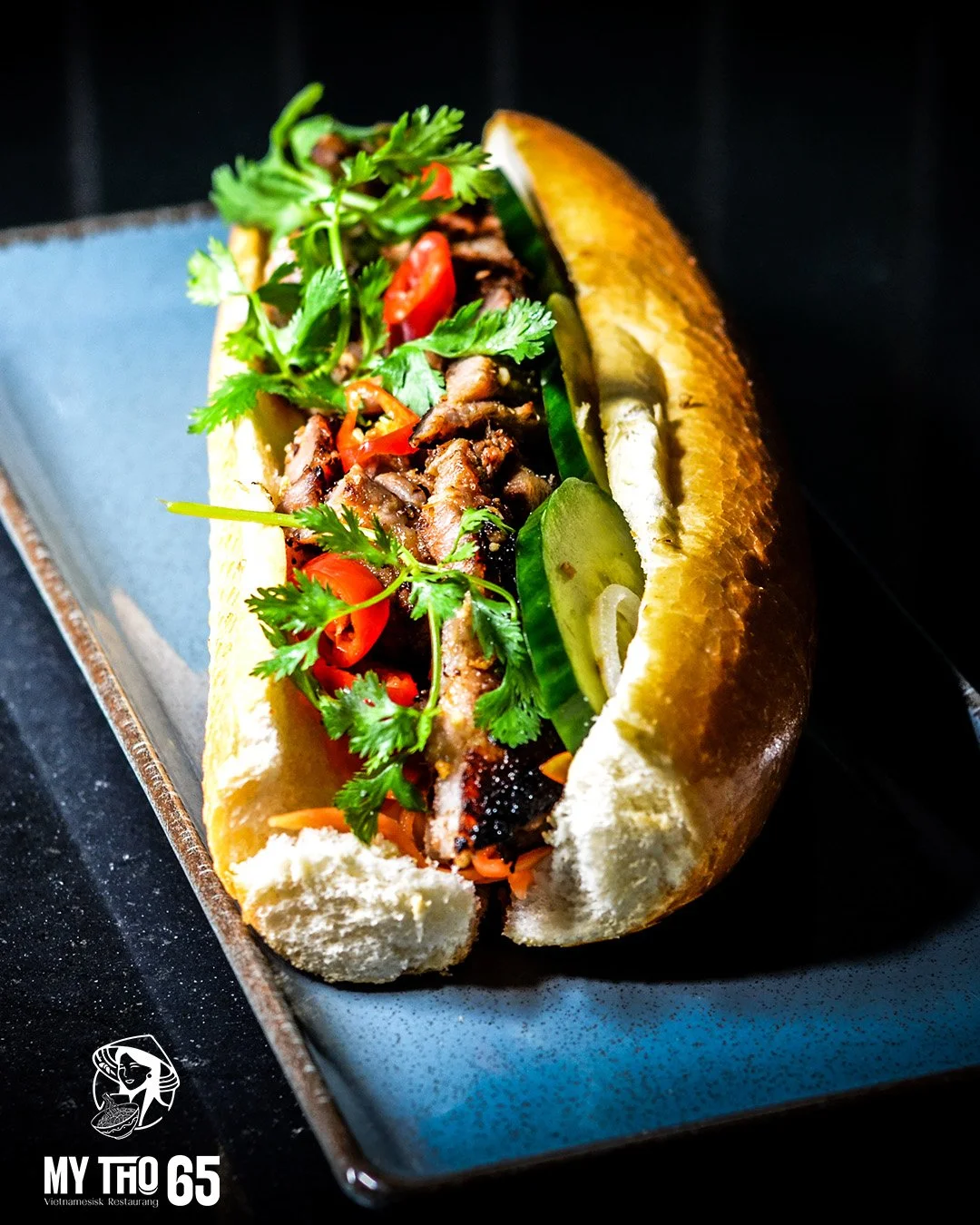 Baguette fylld med grillad fläskkarré eller tofu, inlagd rättika, morot, gurka, koriander, chili, smör & soya